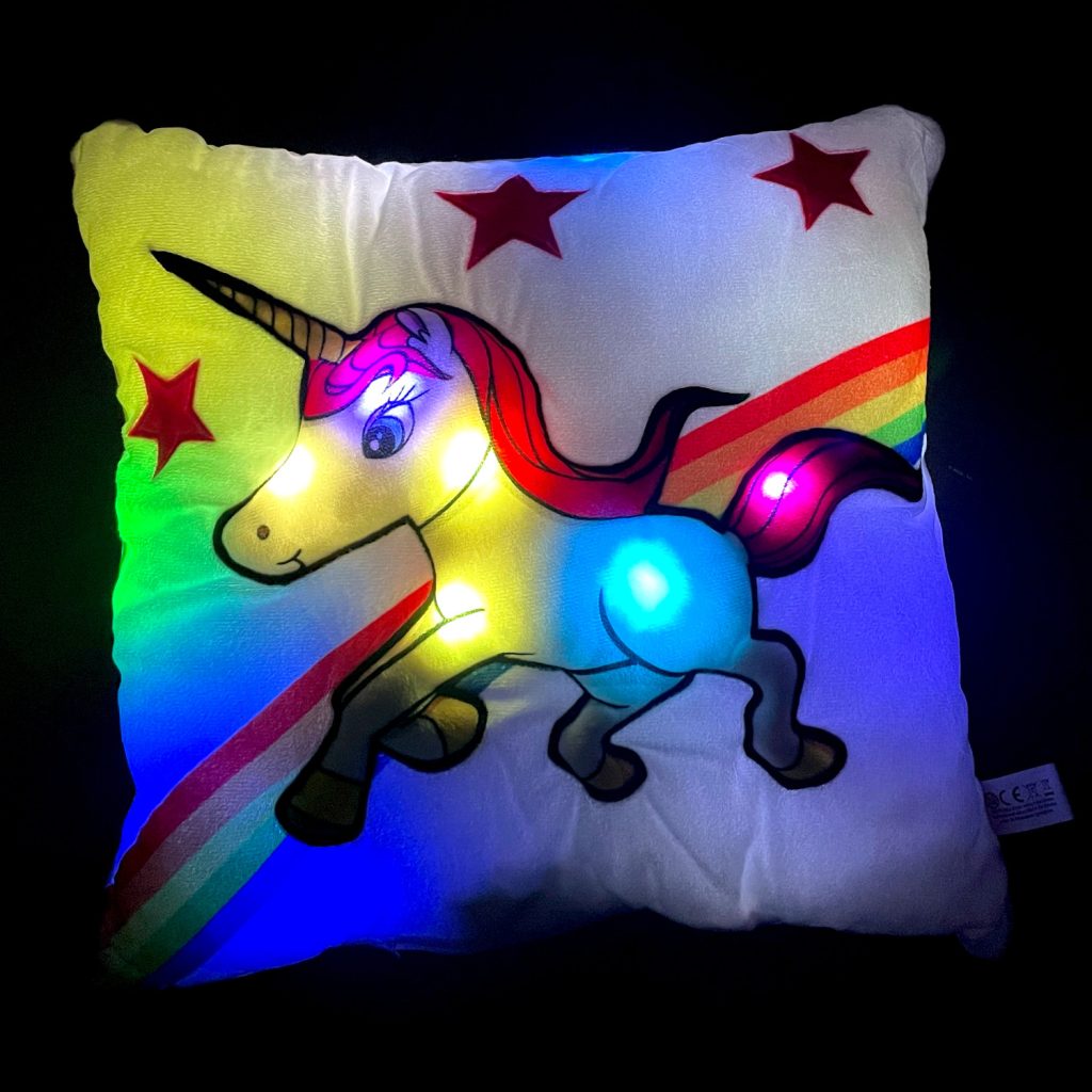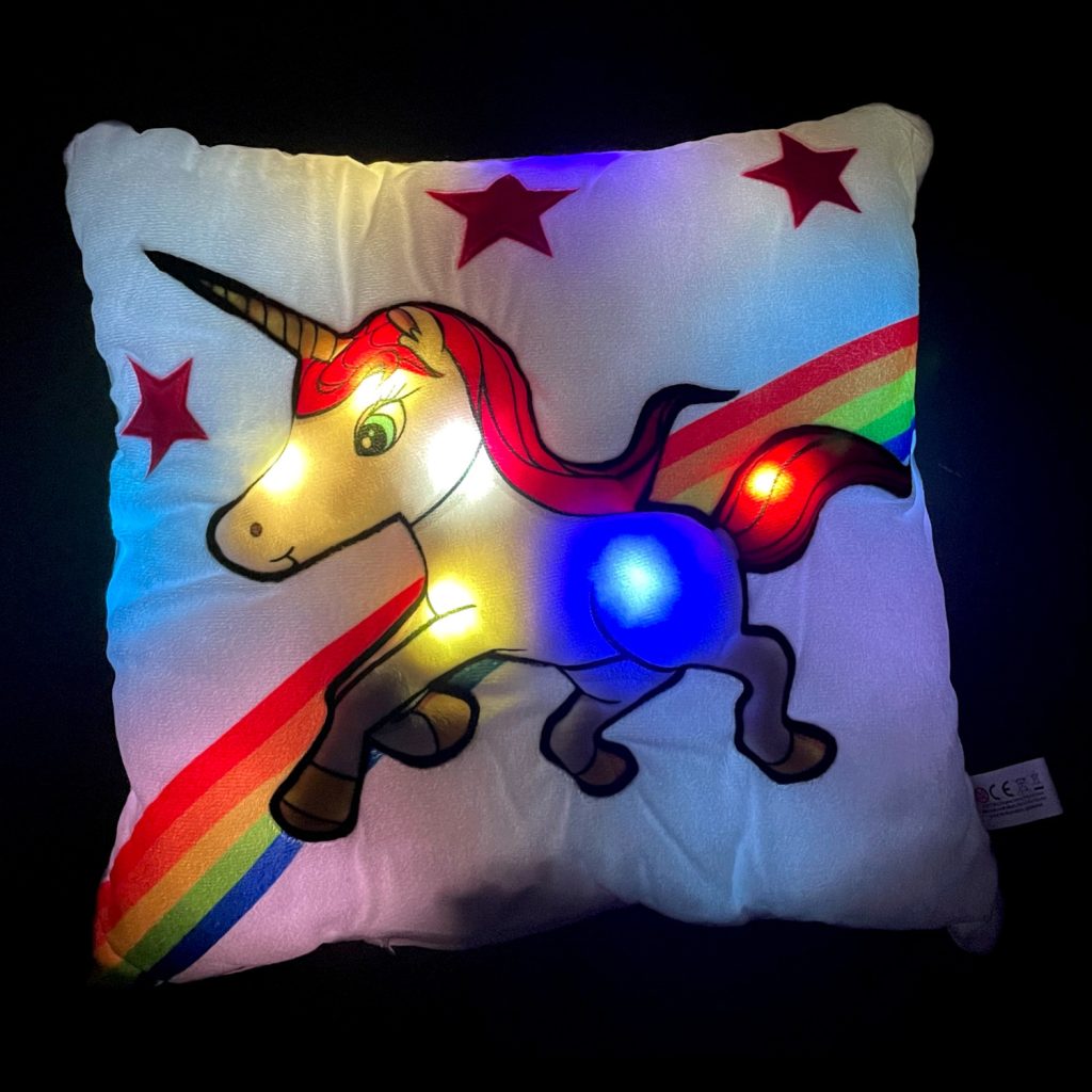 Das LED Plüschkissen Einhorn mit Regenbogenbeleuchtung bringt Farbe und Magie in jedes Zimmer. Es leuchtet in verschiedenen Farben und passt perfekt als gemütliches Kuschelkissen aufs Sofa oder ins Kinderzimmer.