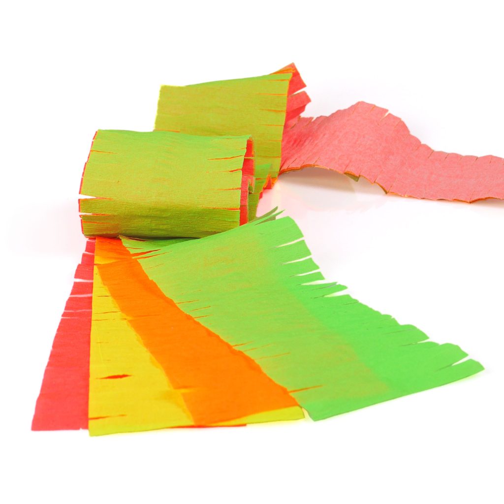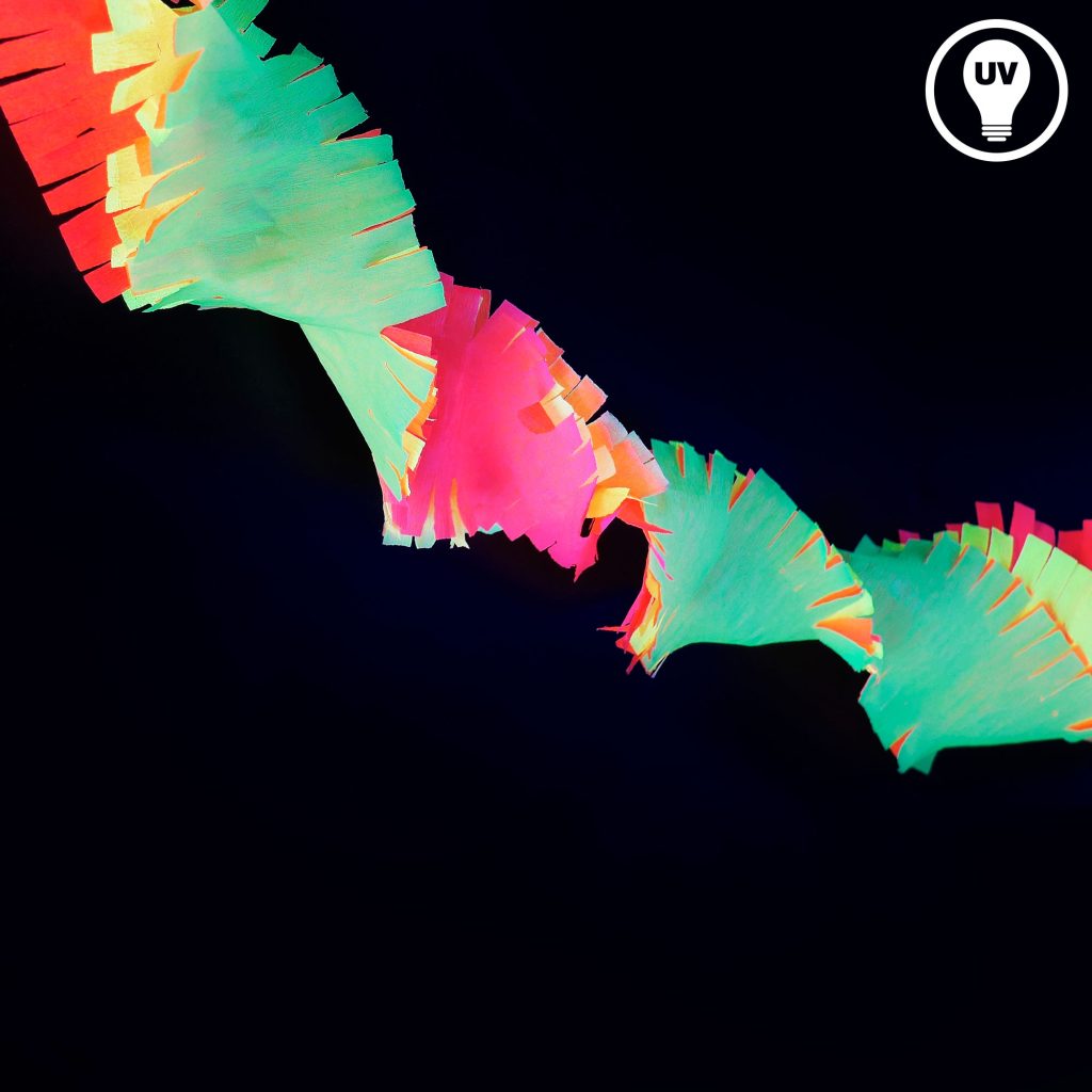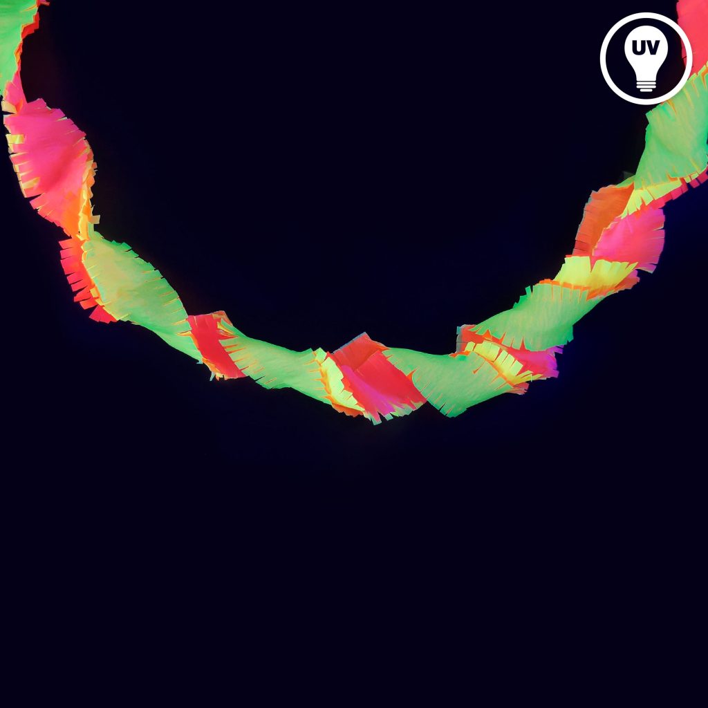 Die Neon Drehgirlande Regenbogen ist die ideale Partydeko, um jeder Feier ein lebendiges und farbenfrohes Ambiente zu verleihen. Mit 18 Metern Länge bietet sie genügend Spielraum, um deinen Partyraum kreativ zu gestalten. Die Girlande besteht aus mehreren Lagen Krepppapier in Neonfarben (rot, gelb, orange, grün), die im Schwarzlicht leuchten (UV-aktiv). So sorgt sie sowohl bei Tageslicht als auch im Schwarzlicht für beeindruckende Leuchteffekte.