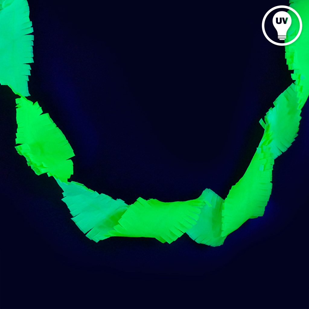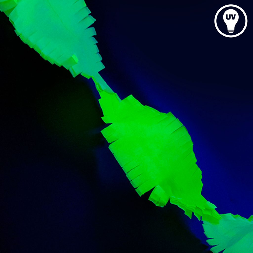 Die Neon grüne Drehgirlande mit einer Länge von 18 Metern ist die ideale Lösung für alle, die ihre Party oder Veranstaltung mit einem kraftvollen grünen Akzent bereichern möchten. Die intensive grüne Farbe des Krepppapiers leuchtet im Schwarzlicht und sorgt für eine energiegeladene Stimmung.