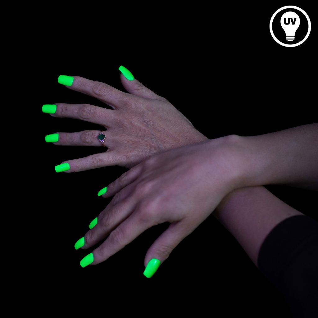 - Glänzendes Kunststoff-Finish: Die Nägel leuchten sehr gut im Schwarzlicht und sind einfacher anzuwenden als Neon-Nagellack.