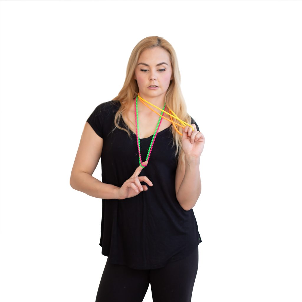 Diese Neon Perlenketten machen das 80er Outfit komplett! Die Ketten können unabhängig voneinander verwendet werden – es können also mehrere Partygäste mit Perlenketten ausgestattet werden!