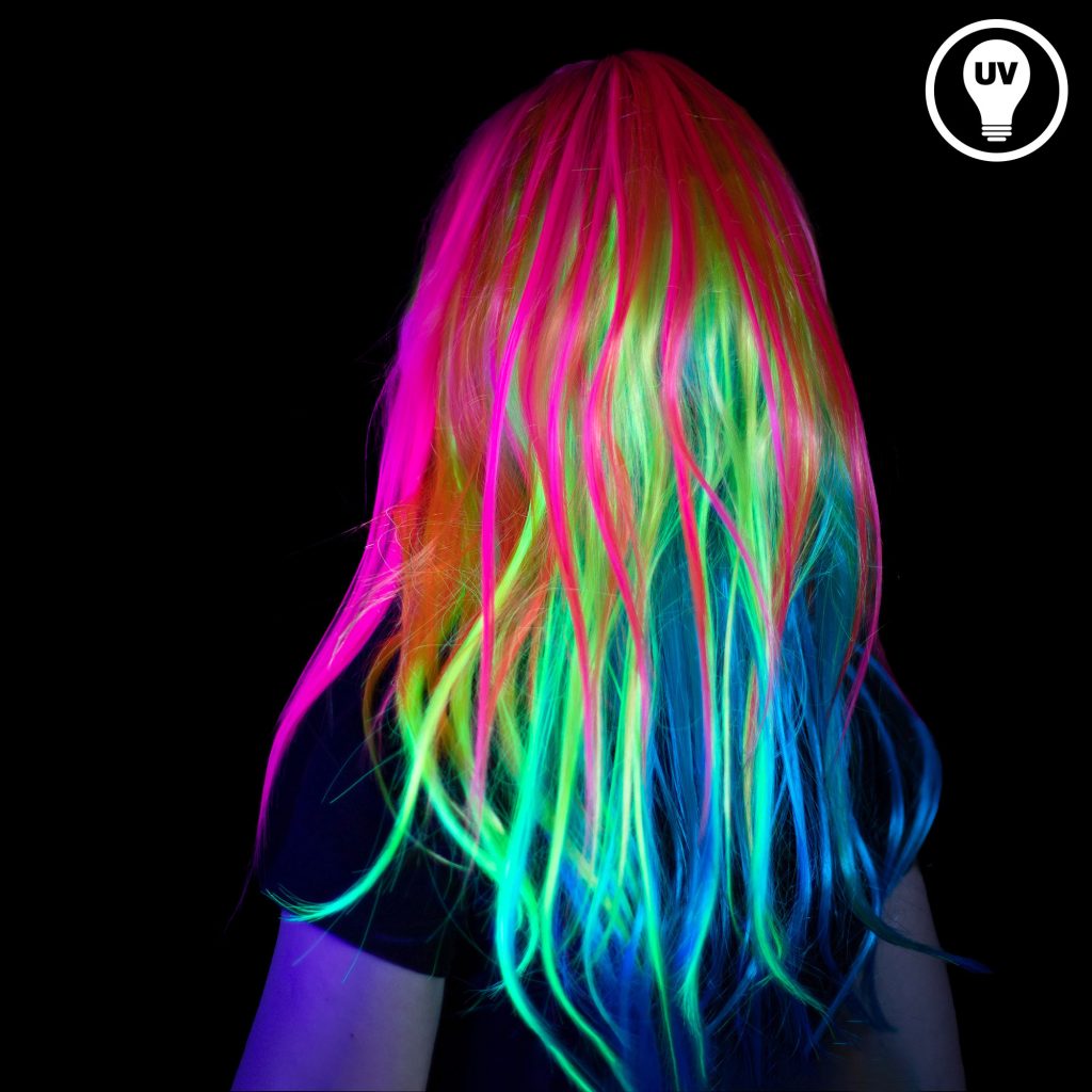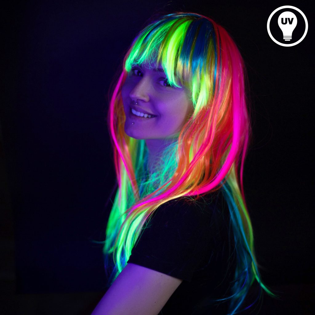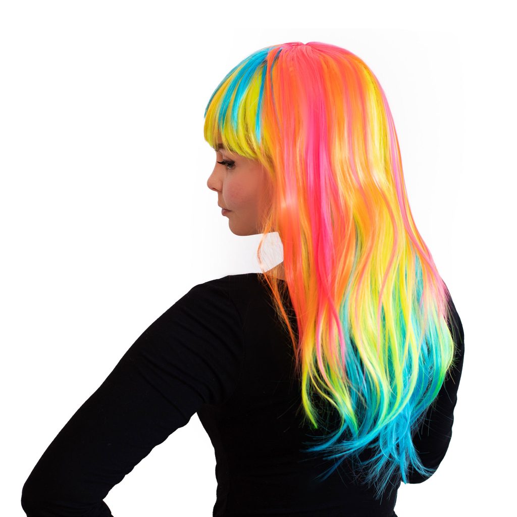 Mit der langen Neon-Regenbogen-Perücke sorgst du auf vielen Events für Aufsehen. Die auffälligen Farben leuchten im Schwarzlicht und bringen dich zum Strahlen. Egal ob Karneval, Fasching, Neonparty, 80er Party, Mottoparty, Regenbogenevent, Festival, Club oder Disco – diese Perücke ist der perfekte Hingucker.