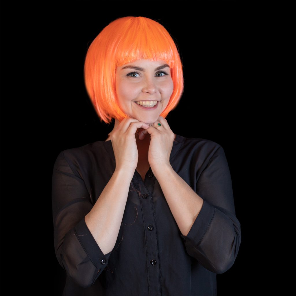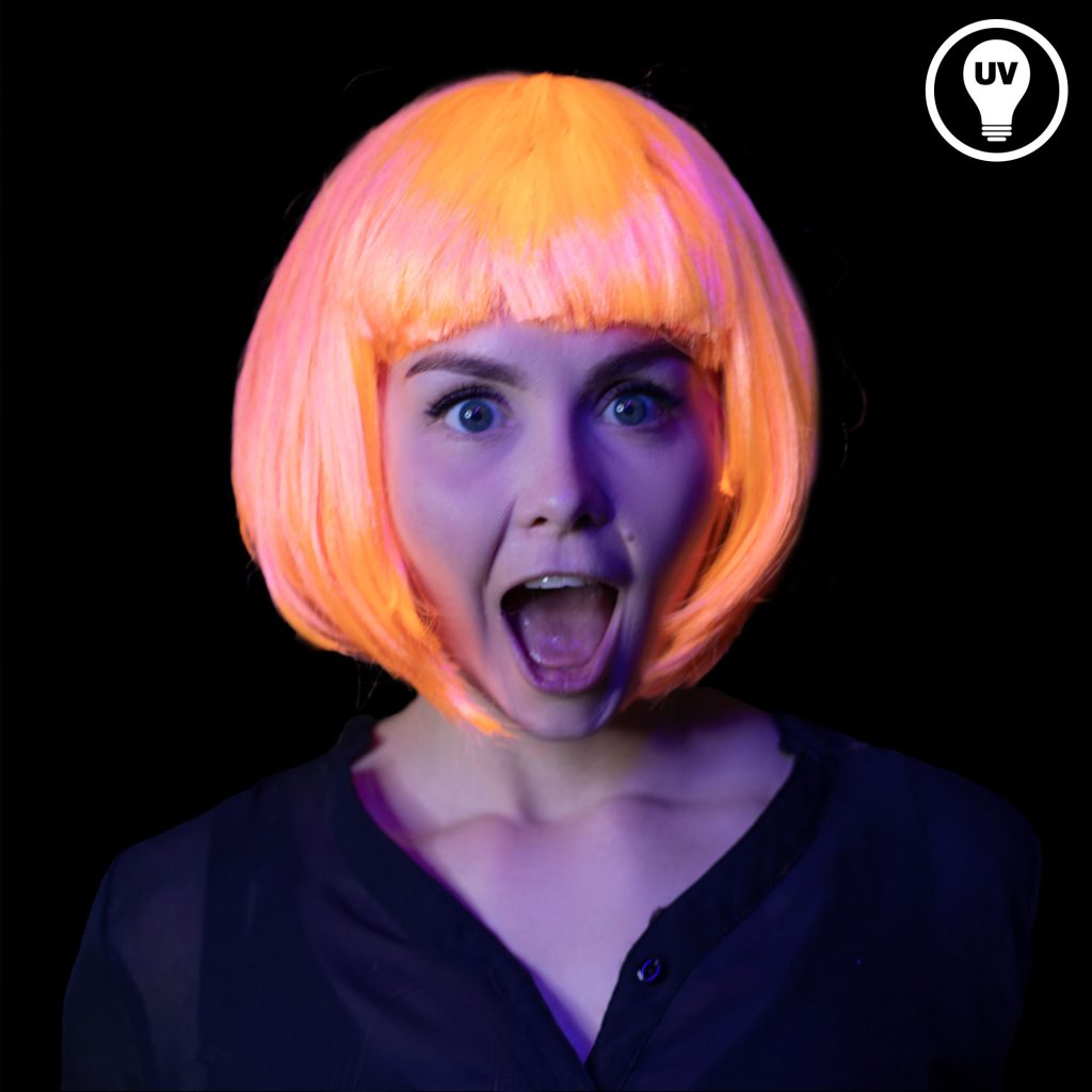 Die Schwarzlicht-Perücke im Bob-Stil fällt schon tagsüber durch das leuchtende Neonorange auf, unter Schwarzlicht (UV-Licht) leuchtet die Perücke noch intensiver.