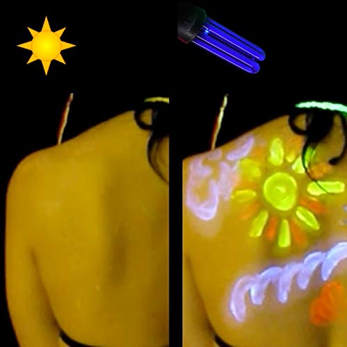 „Unsichtbare“ UV Körpermalfarben sind bei Tageslicht unsichtbar (wie Bodylotion, nachdem sie eingezogen ist) und leuchten im Schwarzlicht. Dadurch kann Bodypaint Kunst tagsüber gut versteckt werden, und dann erst Nachts in der Disco wie von Zauberhand sichtbar werden.