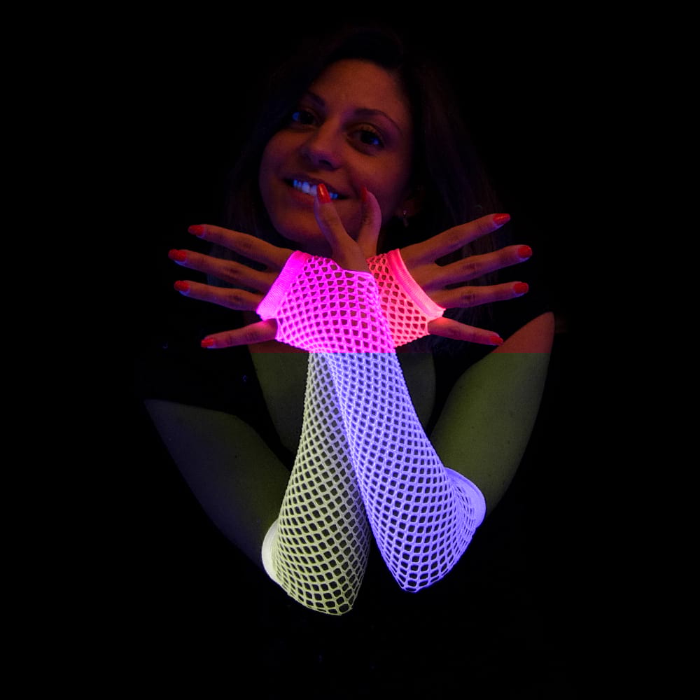 Die Handschuhe leuchten stark im Schwarzlicht!