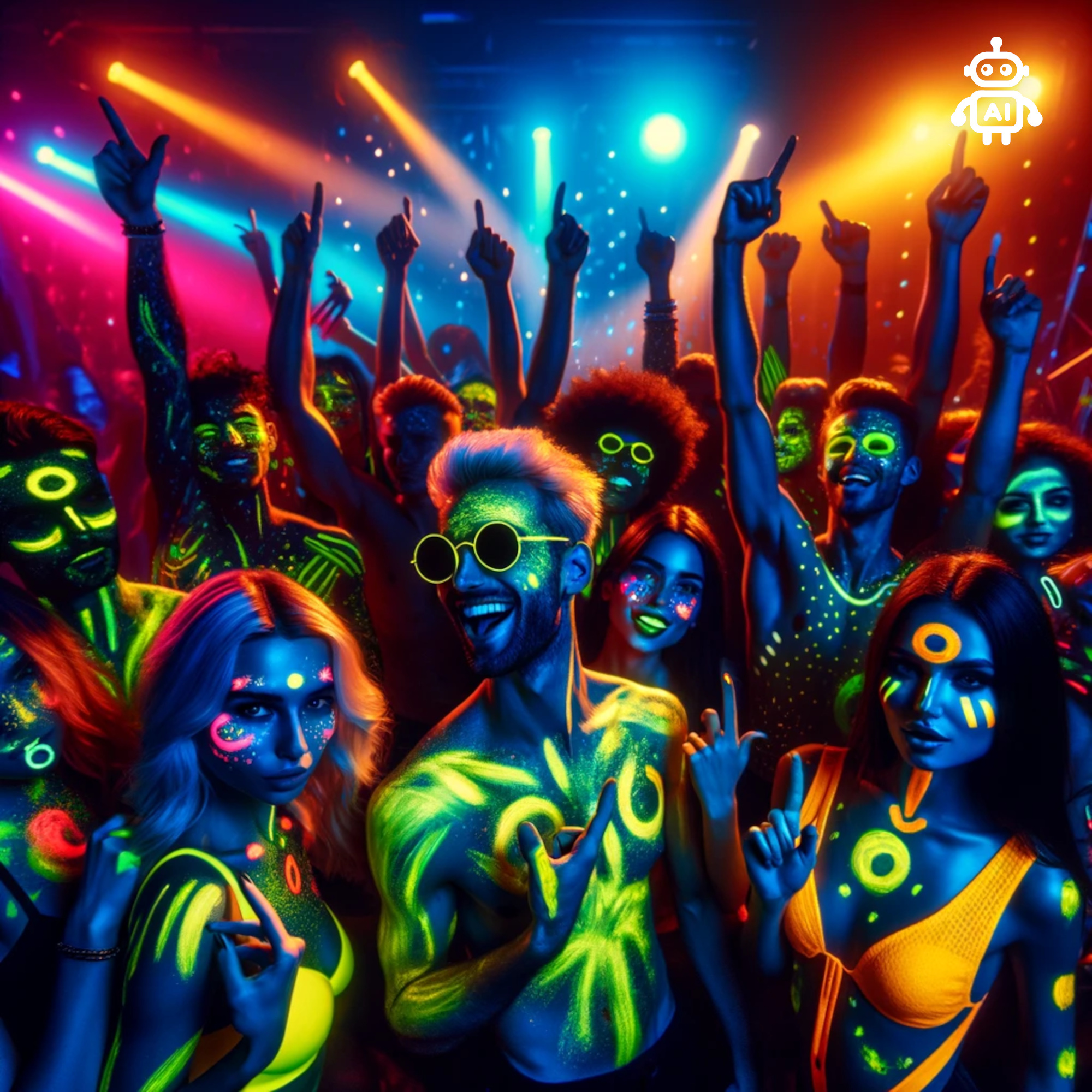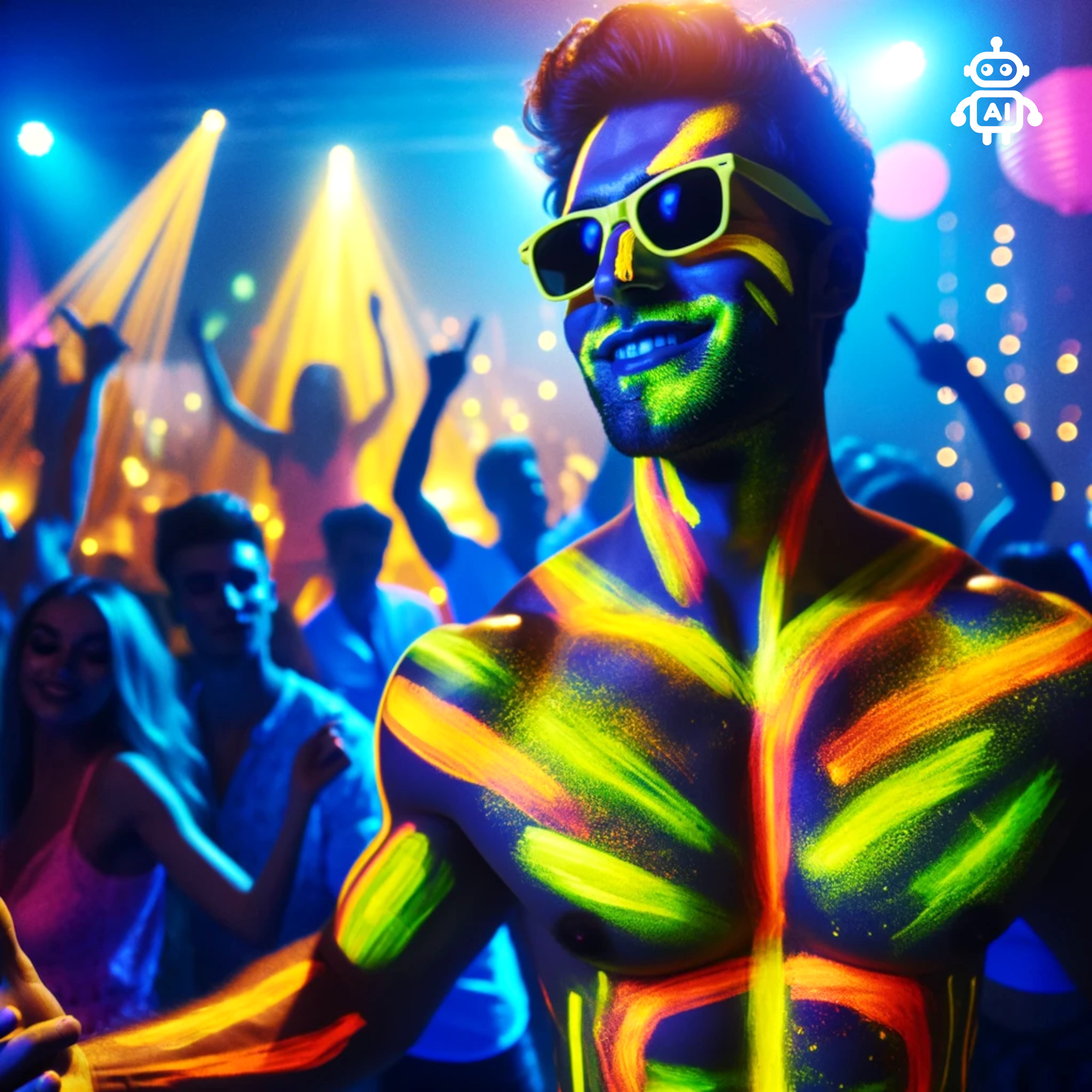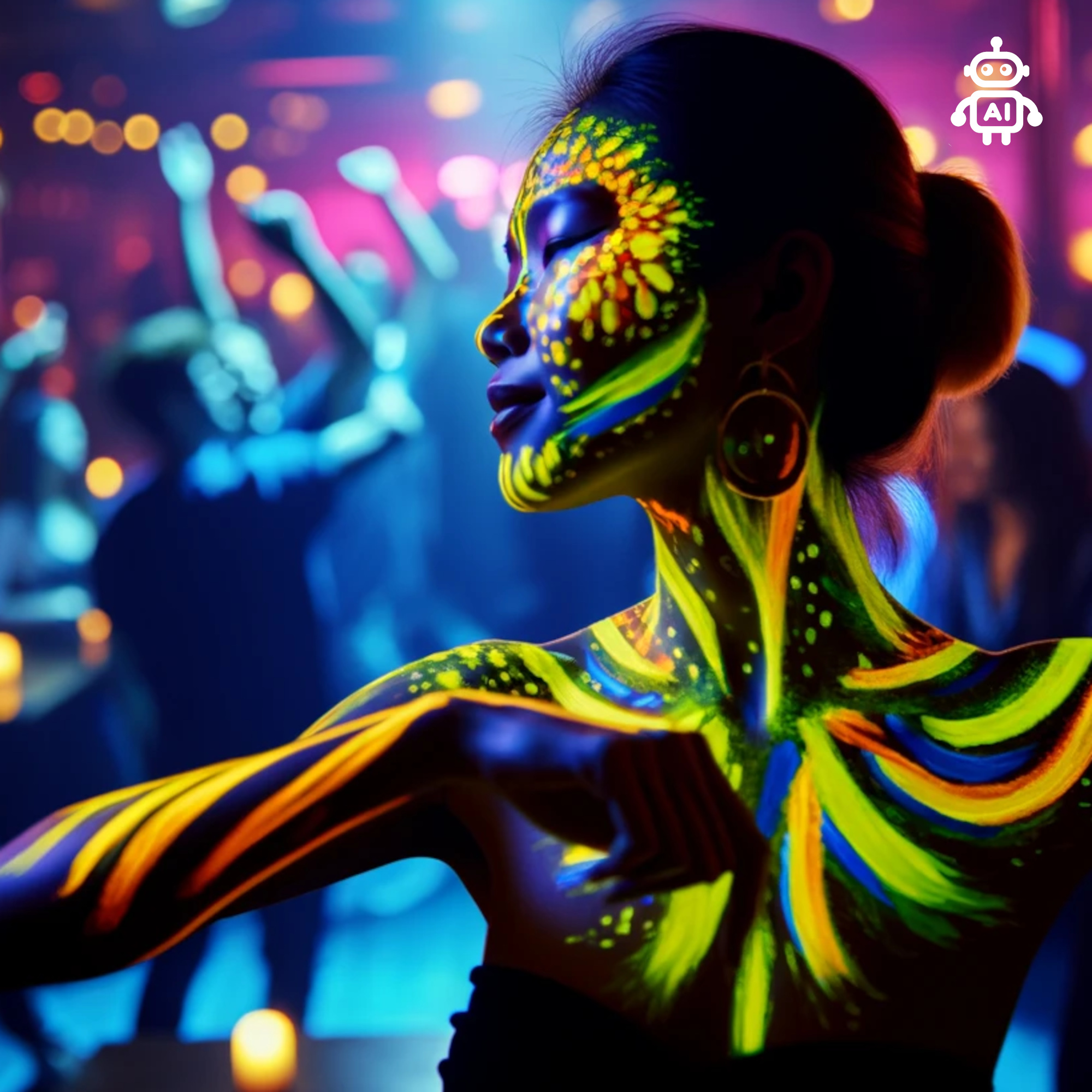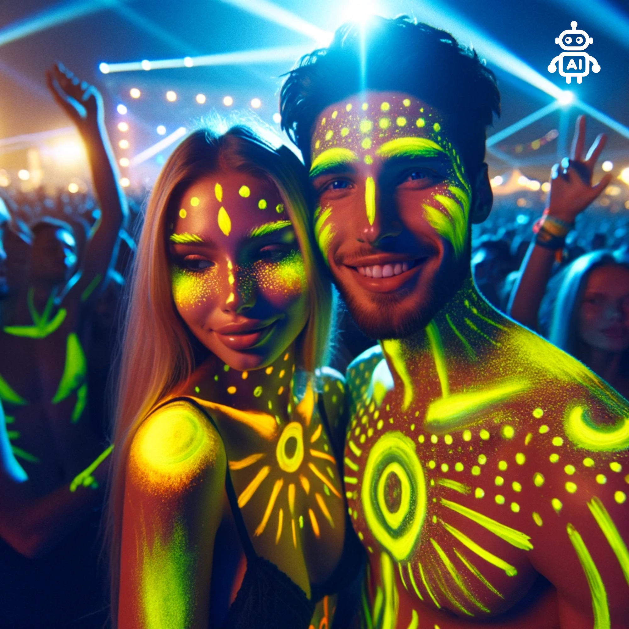 Auch bei Schwarzlicht-Fotoshootings kann die gelbe Neonfarbe eingesetzt werden, um leuchtende Motive auf die Haut zu zaubern. Die Farbe lässt sich einfach mit einem Pinsel oder den Fingern auftragen. Mit Wasser und Seife lässt sie sich leicht wieder entfernen.