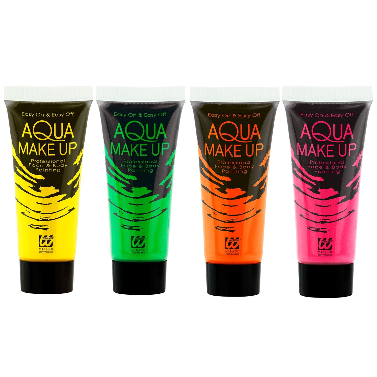Mit der Neon UV Bodypaint Farbe PRO im 4 x 30 ml Set kannst du deiner künstlerischen Ader freien Lauf lassen, egal ob auf Mottopartys, im Club oder zu Fasching und Karneval. Die intensiven Neonfarben leuchten hell im Schwarzlicht und machen deine Körperkunst zum Blickfang – egal ob bei Tageslicht oder im Disco-UV-Licht.