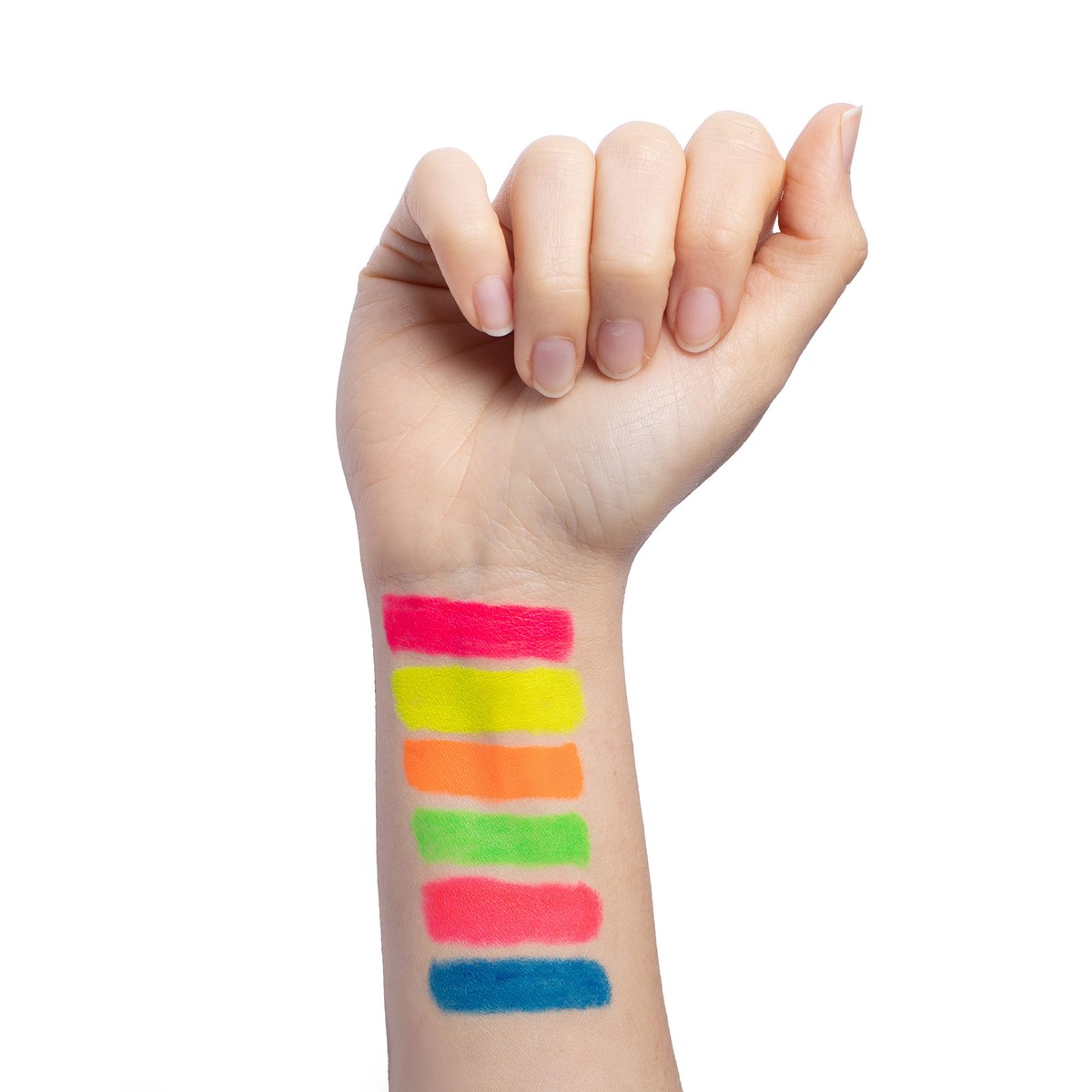 - 6 Neon Bodypaint Stifte in den Farben grün, orange, gelb, pink, blau und rot.