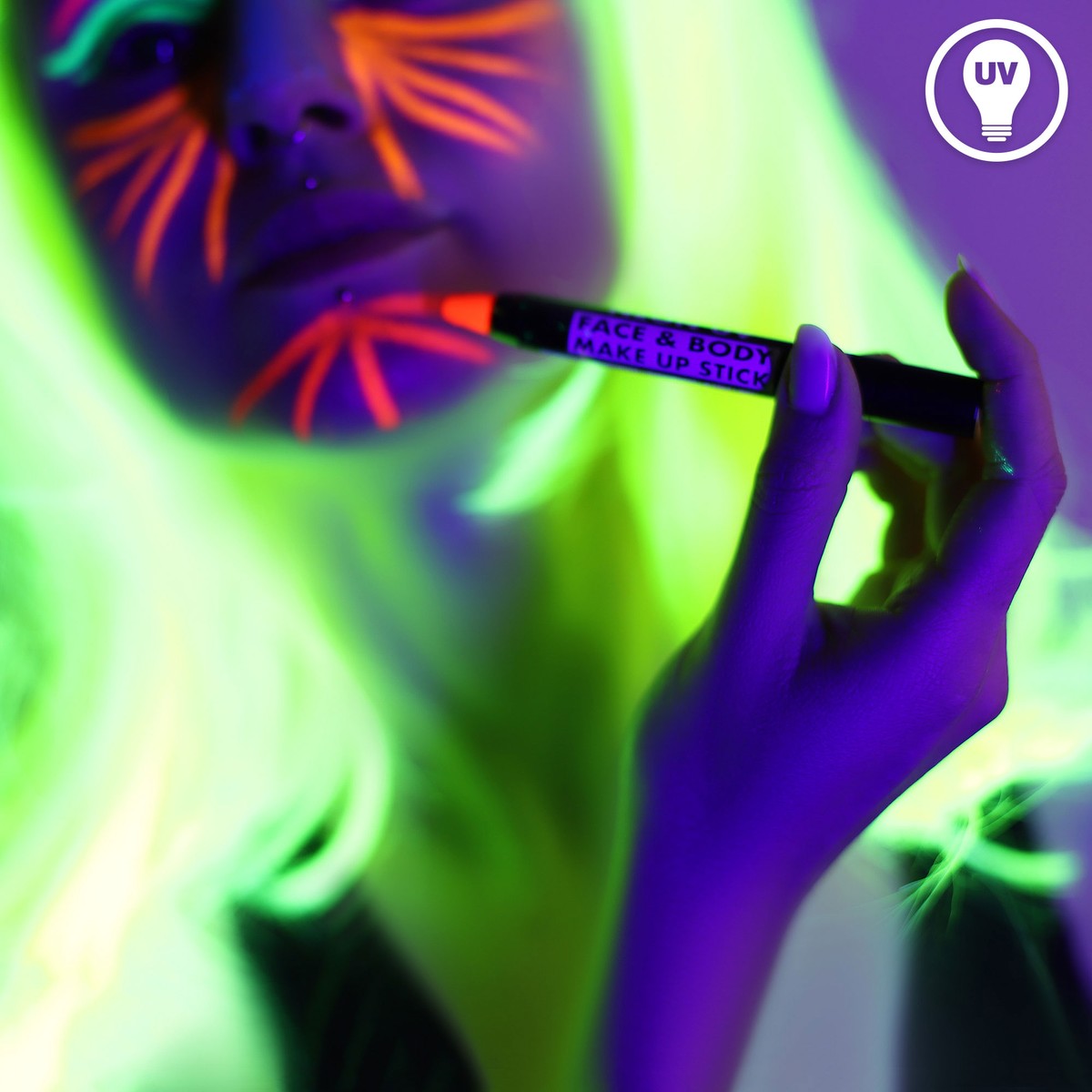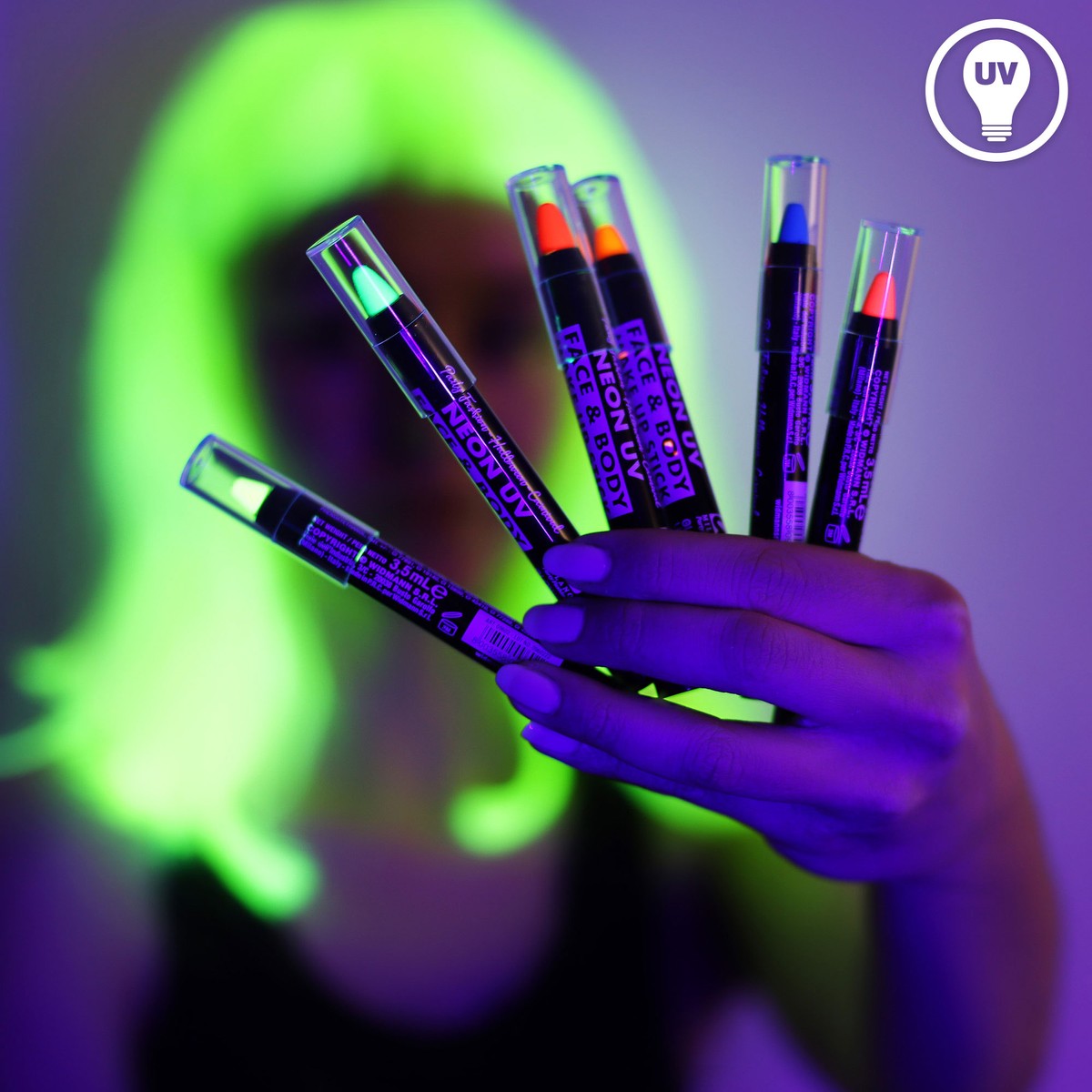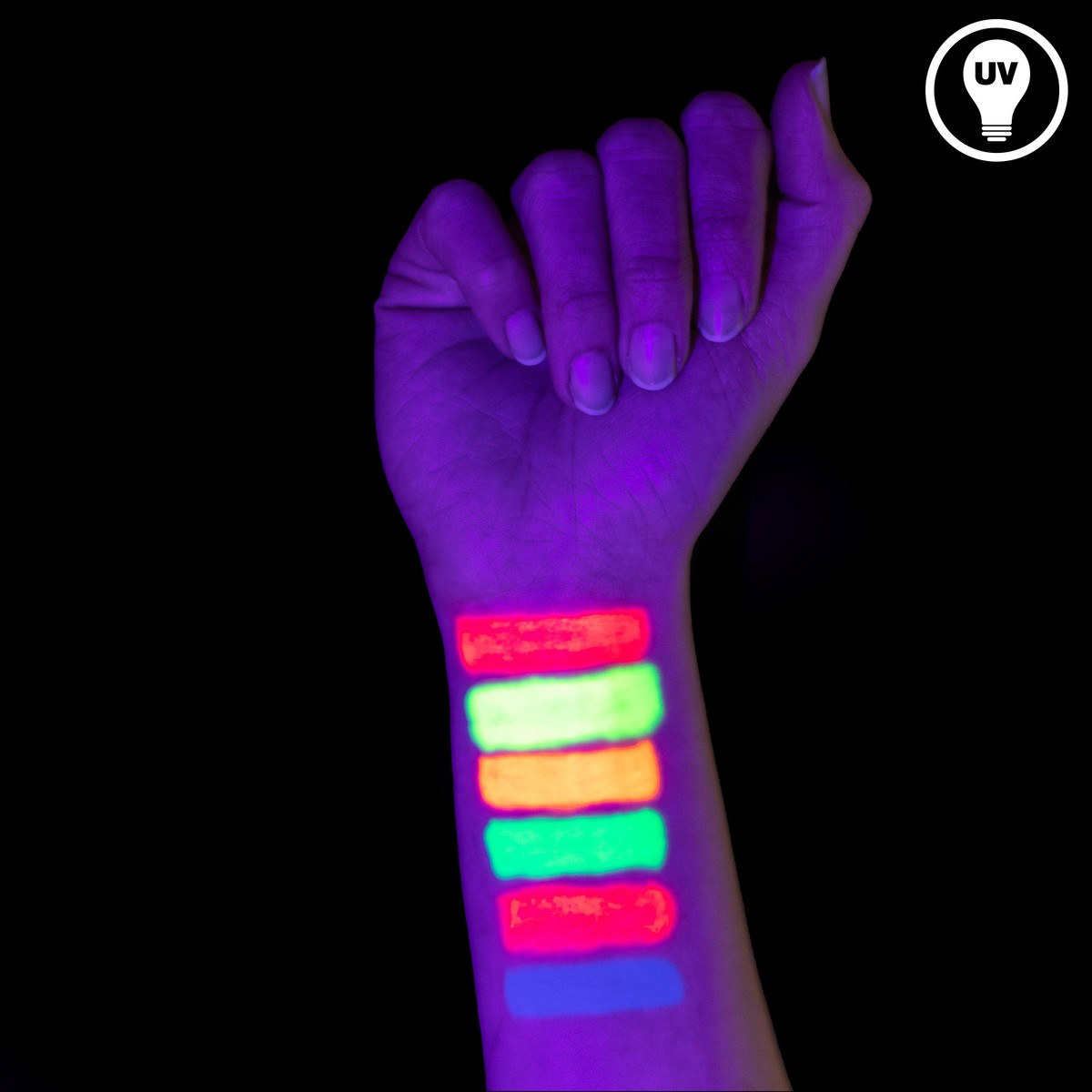 Zeichne mit unseren Bodypaint-Stiften leuchtende Motive auf deine Haut: Alle 6 Farben leuchten hell unter Schwarzlicht, perfekt für Disco, Schwarzlichttheater & Festivals!