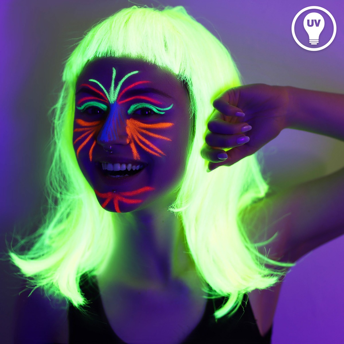 Alle Neon Bodypaint Fotos wurden von uns gemacht, um den Tageslicht-/Schwarzlichteffekt möglichst realistisch darzustellen. Wir haben auf eine starke Nachbearbeitung der Fotos verzichtet und selbstverständlich die hier angebotenen Bodypaint-Stifte verwendet. Der Schwarzlichteffekt hängt von der Stärke der UV-Lampen im Partyraum ab, für einen guten Leuchteffekt ist starkes Schwarzlicht notwendig.