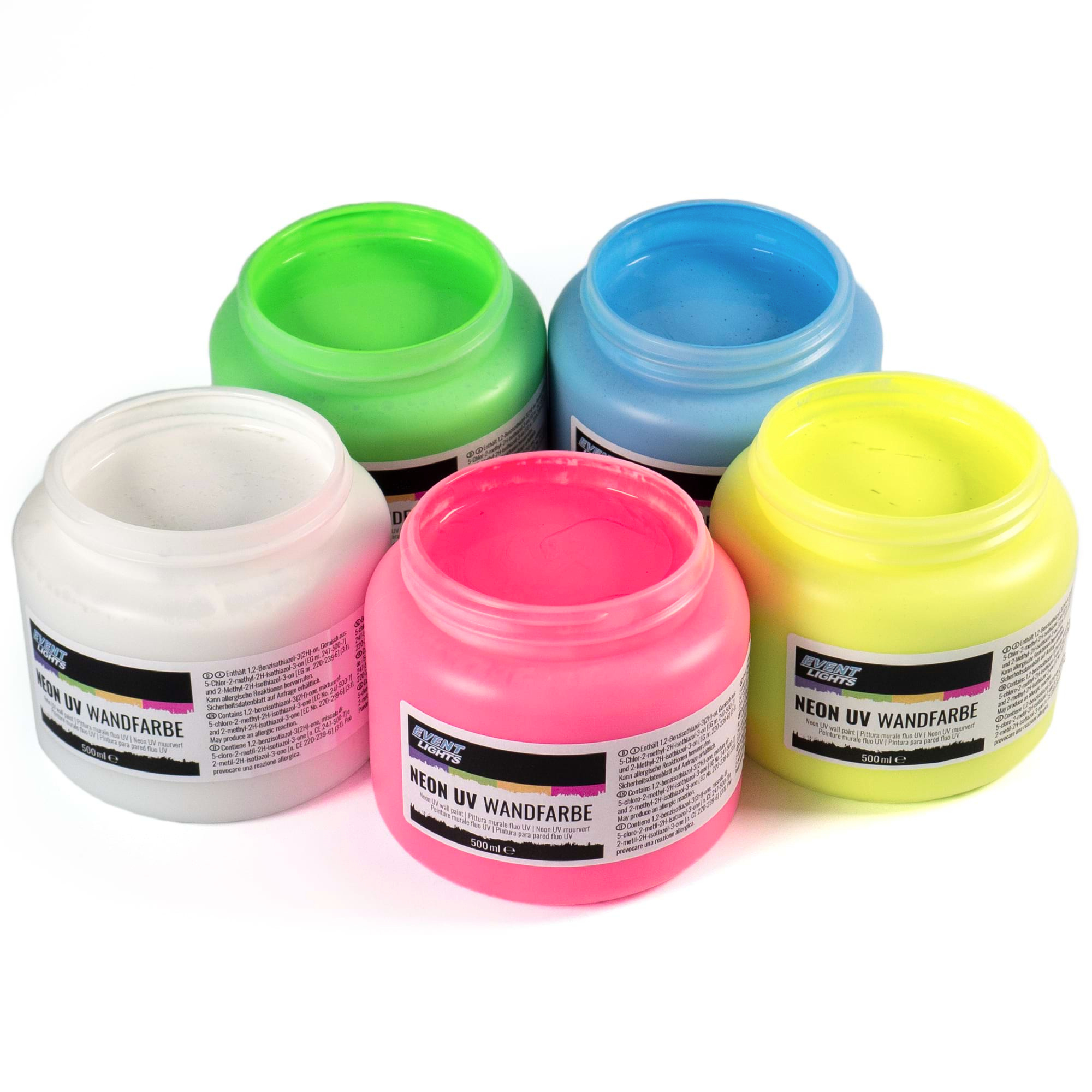 Farben im Set: blau, gelb, grün, pink, weiß (5 x 500 ml)