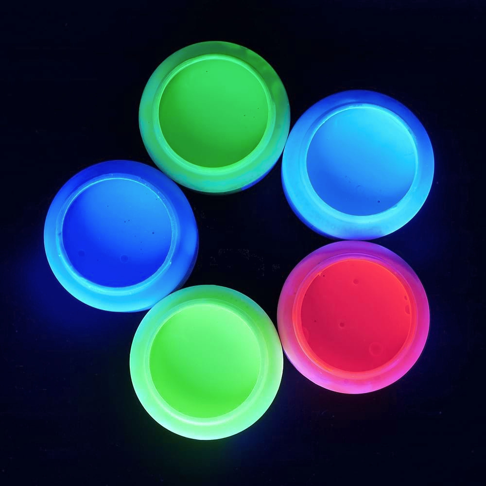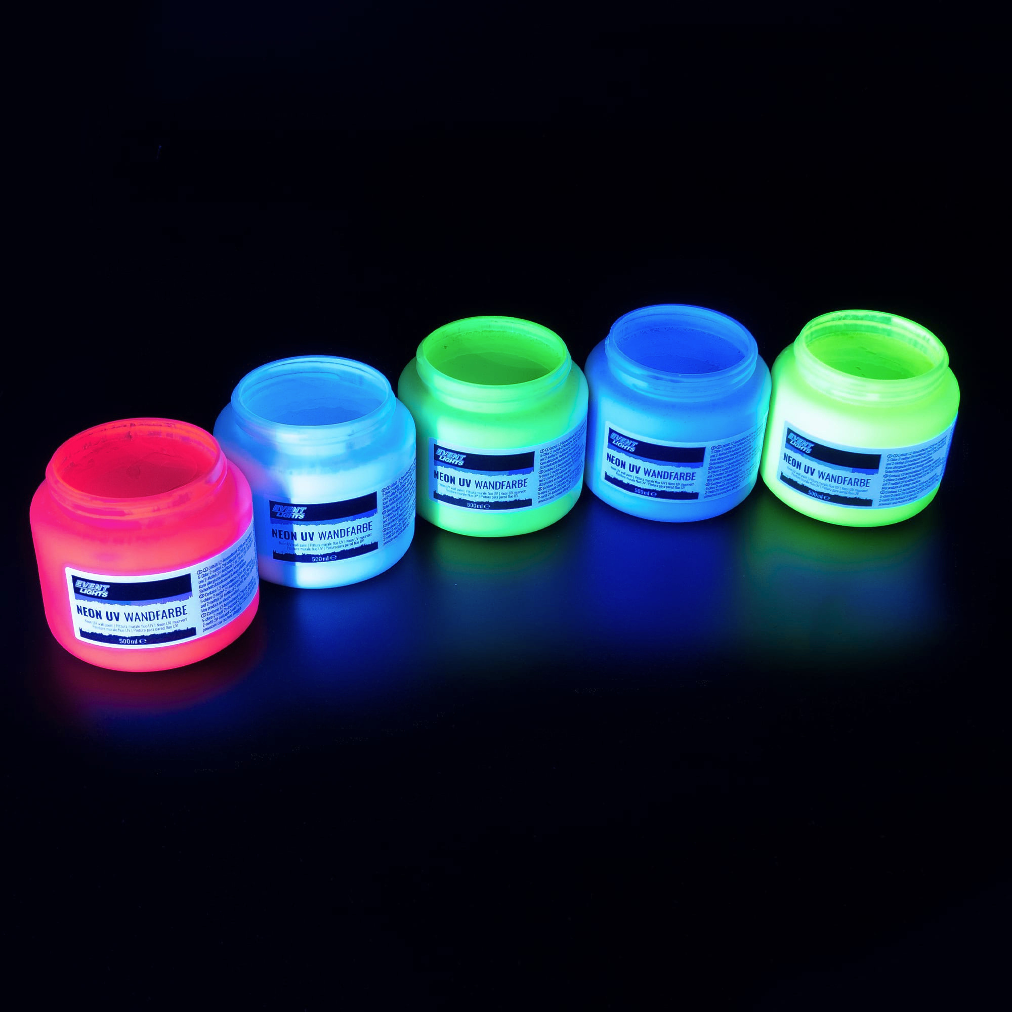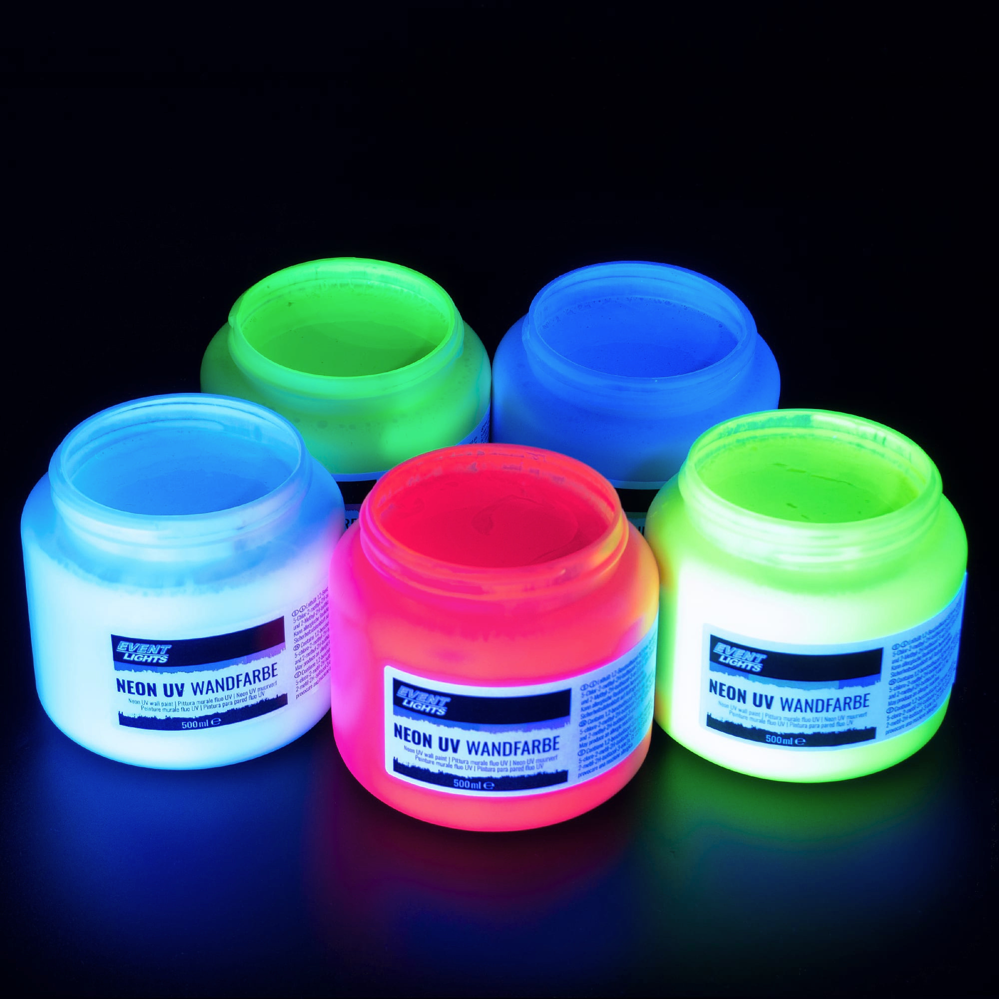 Unsere UV-aktiven Neon-Wandfarben haben knallig neonfarbene* Farbtöne im Tageslicht. Das Besondere ist aber der Leuchteffekt im Schwarzlicht: Die Farben leuchten durch die fluoreszierenden Farbpigmente bzw. UV-Aufheller besonders hell im Schwarzlicht (UV Licht).